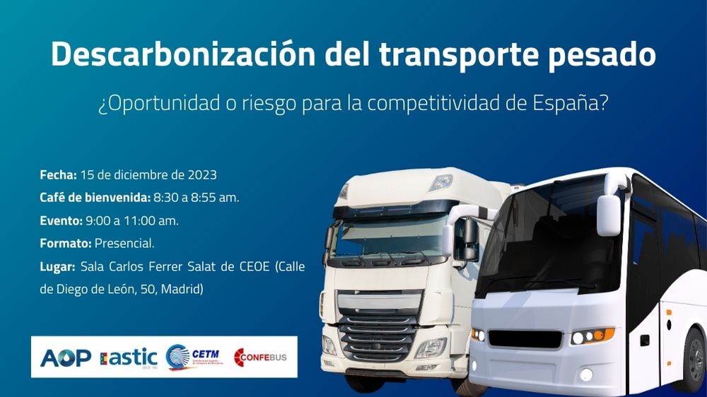 El próximo 15 de diciembre, AOP, ASTIC, CETM y CONFEBUS celebrarán la jornada: “Descarbonización del transporte pesado: ¿oportunidad o riesgo para la competitividad de España?”, en la sede de CEOE. El ministro de Transportes y Movilidad Sostenible, Óscar Puente, y el presidente de CEOE, Antonio Garamendi, serán los encargados…
