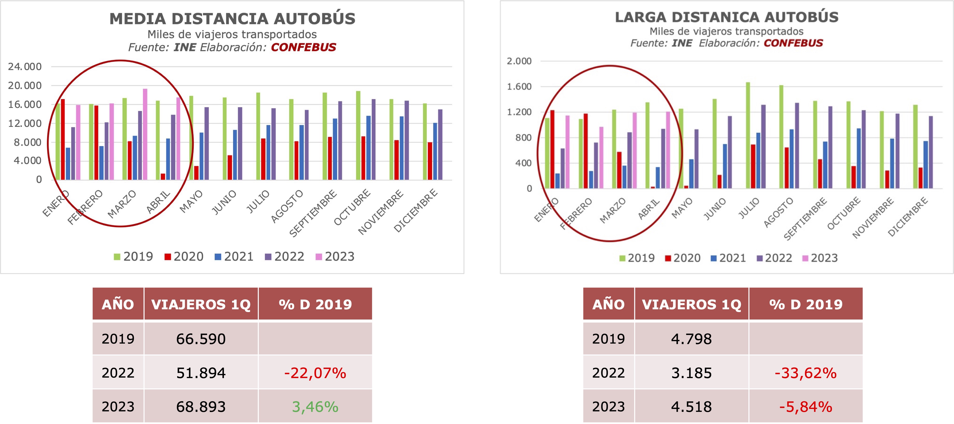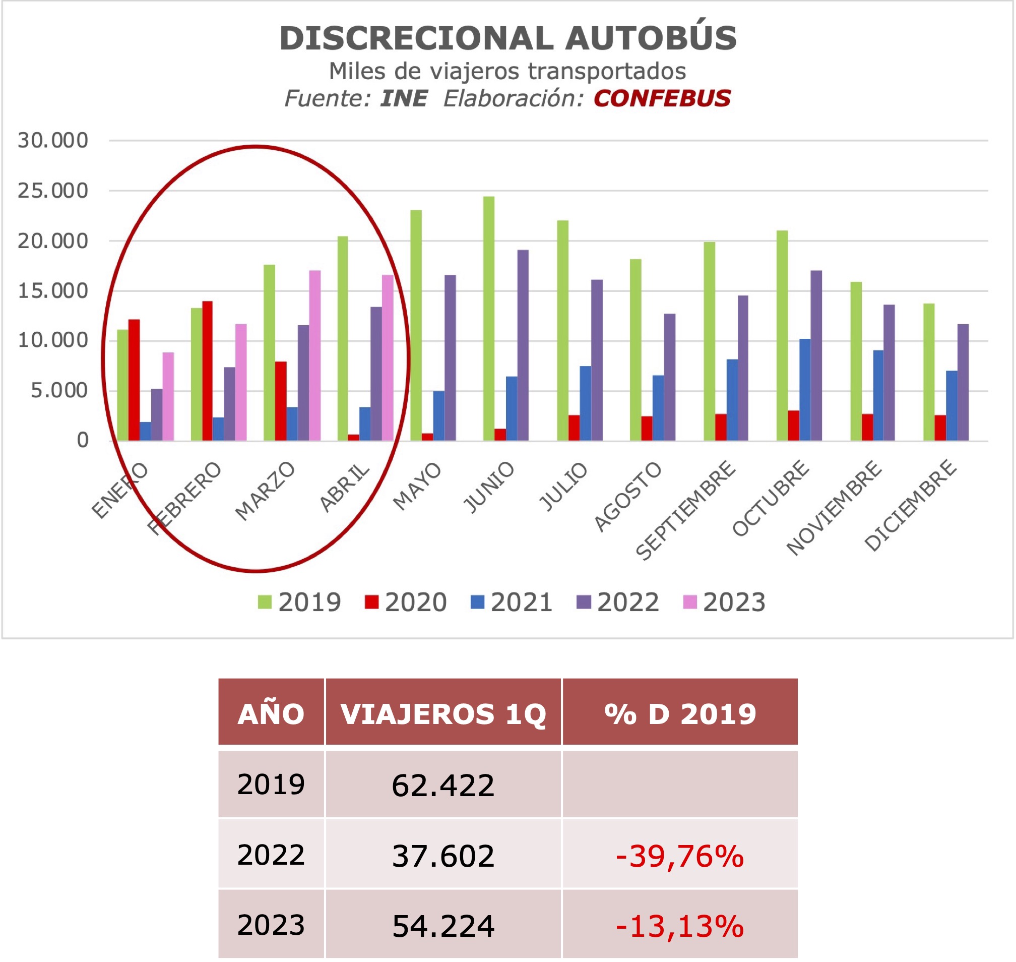 También la demanda de viajeros del transporte discrecional se encuentra un -13,1% por debajo de las cifras del primer cuatrimestre de 2019.