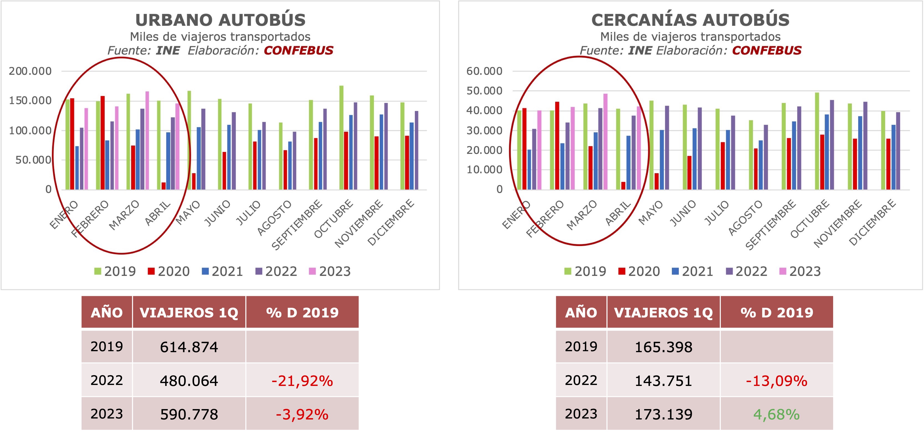 El transporte urbano fue utilizado por más de 254,4 millones de viajeros en abril, un 19,6% más que en el mismo mes del año 2022.