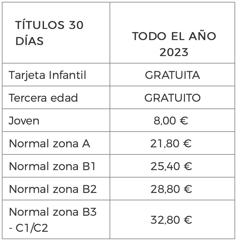 La siguiente tabla detalla los precios del abono de transporte público que permanecerán en vigor a lo largo de 2023: