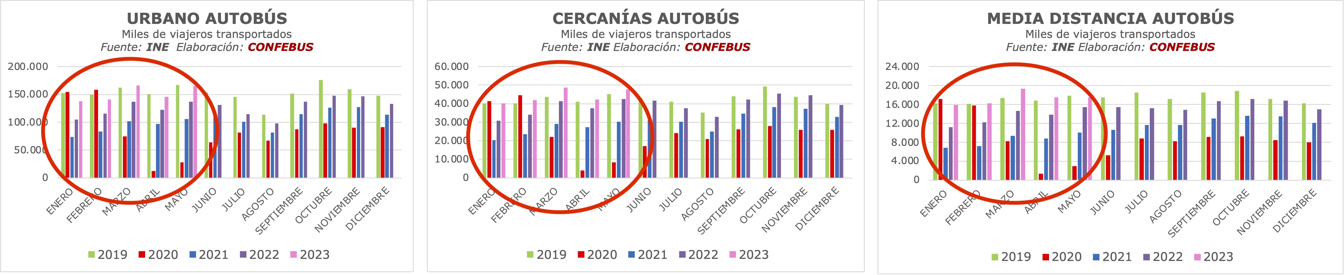 Según los últimos datos publicados por el INE, la media de la demanda del transporte autobús del pasado mes de mayo aún se sitúa a un -9,5% de la media de viajeros de 2019.