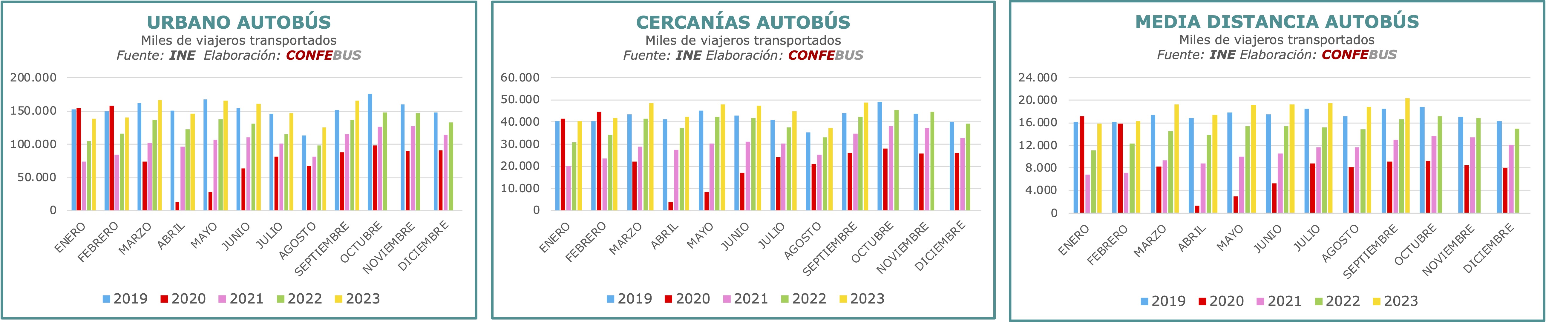 A su vez, el transporte urbano por autobús aumentó un 21,2% en septiembre respecto al mismo mes de 2022. Así, el número de viajeros en el transporte por autobús presentó las mayores subidas en Canarias (48,5%), Región de Murcia (30,3%) y Principado de Asturias (27,1%), dándose el único descenso en Castilla - La Mancha (−0,4%).