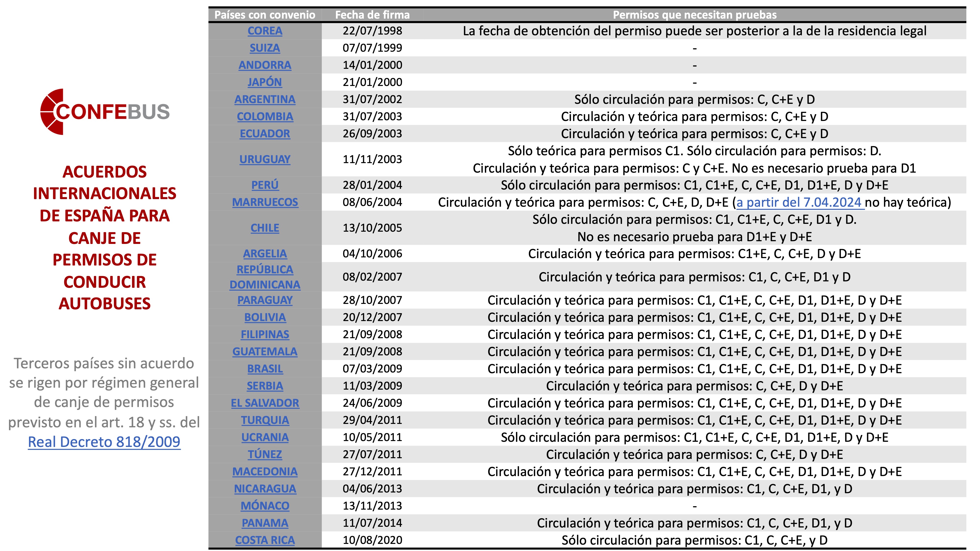 Existen veintiocho acuerdos internacionales suscritos por España que permiten intercambiar permisos expedidos en esos países por carnets de conducir autobuses en nuestro país, de los cuales la mitad corresponden a países latinoamericanos.