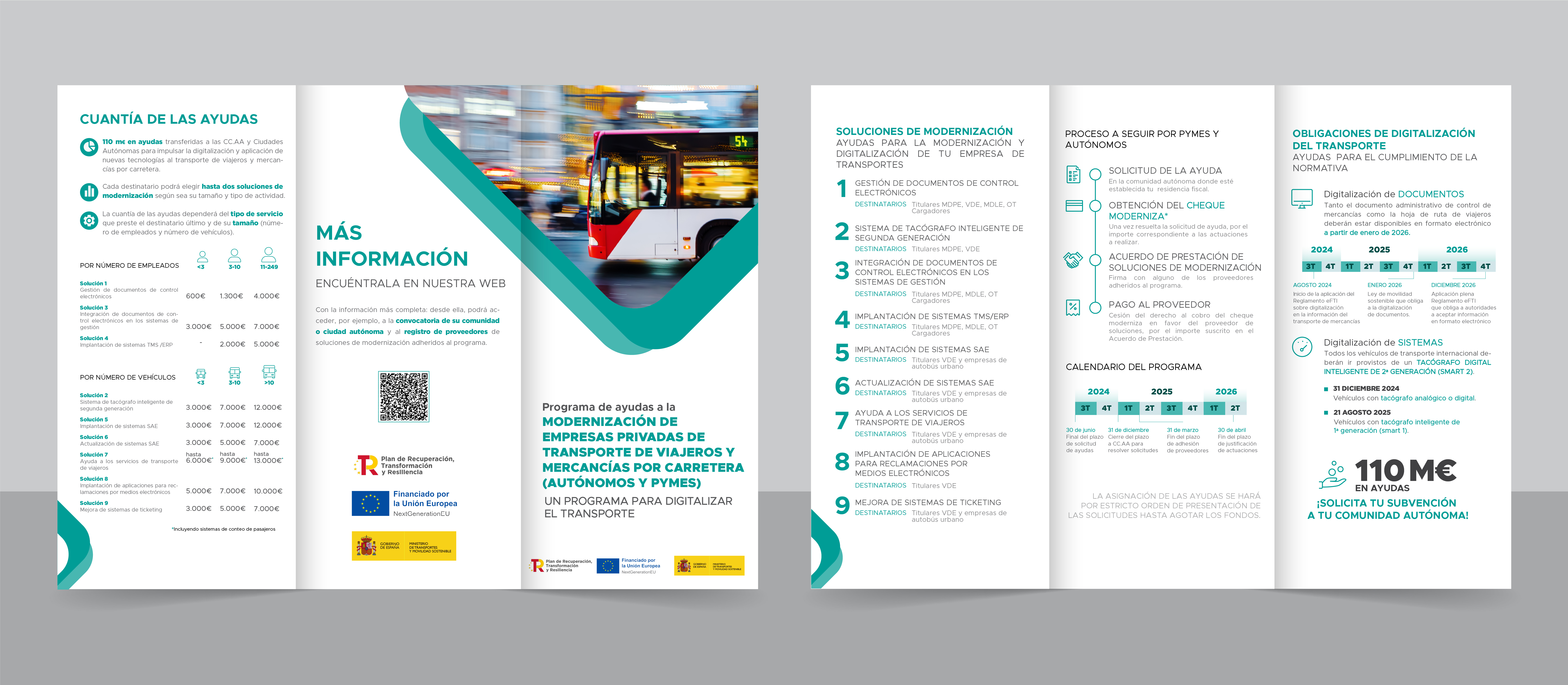 El Ministerio de Transportes y Movilidad Sostenible ha aprobado la transferencia de 110 millones de euros de los Fondos Next Generation a las comunidades y ciudades autónomas para impulsar la modernización y digitalización de empresas privadas (autónomos y pymes) del sector del transporte de viajeros y de mercancías por carretera. En el siguiente enlace se puede encontrar el tríptico informativo que ha elaborado el Ministerio sobre estas ayudas.