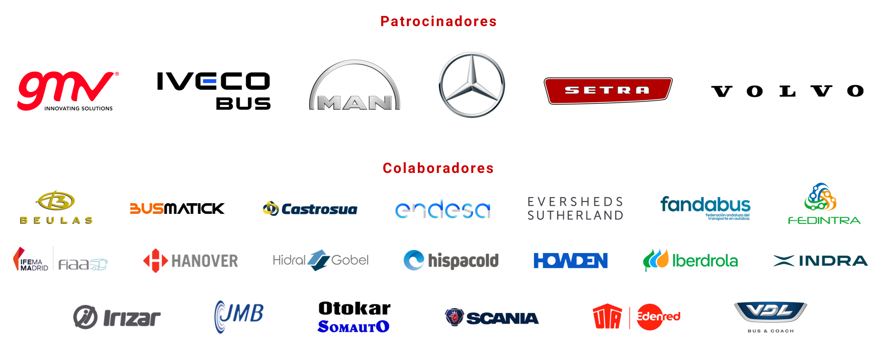 Para la organización de CONFEBUS Summit 2025, en esta edición contamos, hasta la fecha, con el patrocinio de GMV, IVECO BUS, MAN, MERCEDES-BENZ, SETRA y VOLVO, así como con la colaboración de BEULAS, BUSMATICK, GRUPO CASTROSUA, ENDESA, EVERSHEDS SUTHERLAND, FANDABUS, FEDINTRA, FIAA-IFEMA, HANOVER, HIDRAL GOBEL, HISPACOLD, HOWDEN, IBERDROLA, INDRA, IRIZAR, JMB, OTOKAR-SOMAUTO, SCANIA, UTA EDENRED y VDL.