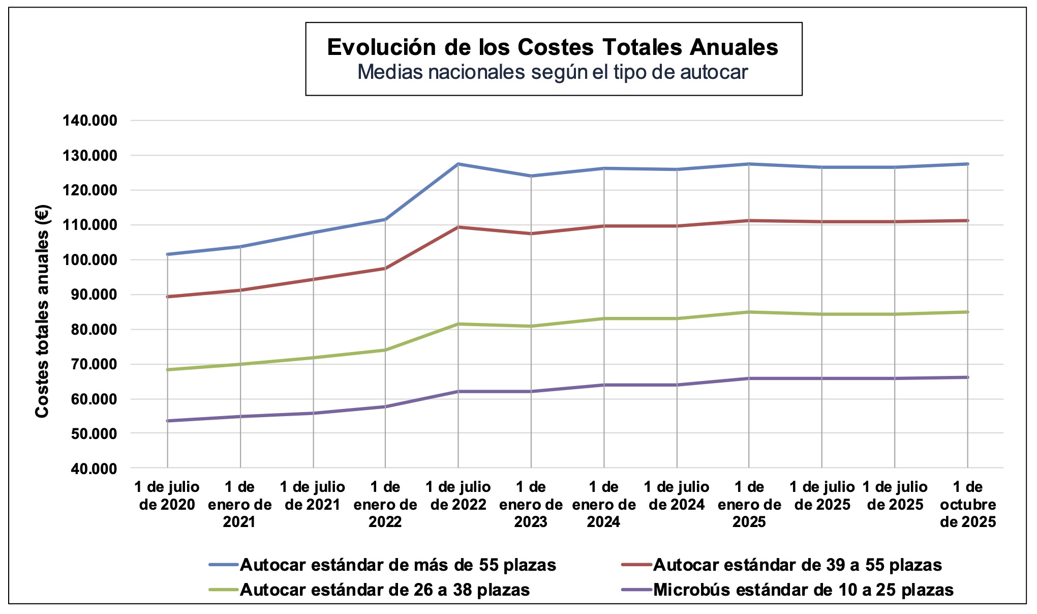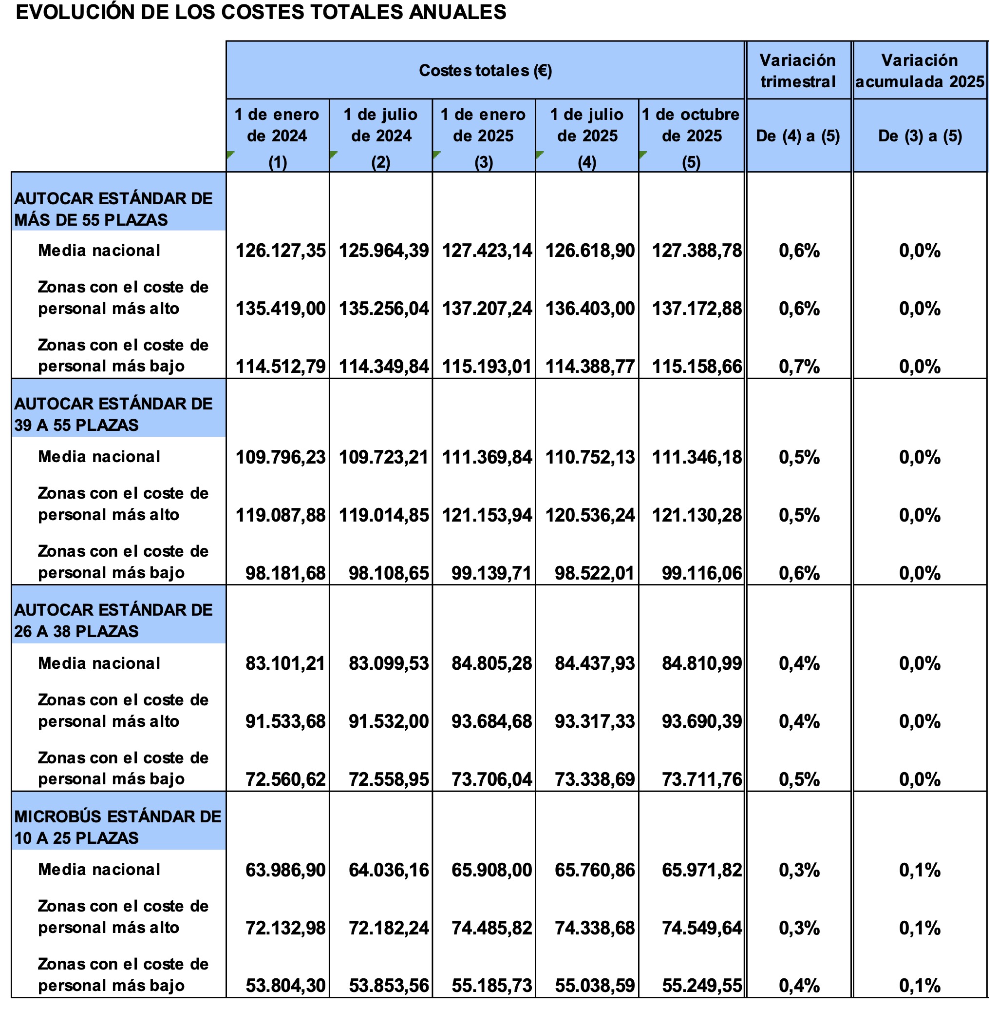 A petición del Departamento de Viajeros del Comité Nacional del Transporte por Carretera (CNTC), la Subdirección General Gestión del Transporte por Carretera y Ferrocarril del Ministerio de Transportes y Movilidad Sostenible ha adoptado una nueva periodicidad del Observatorio de costes del transporte discrecional de viajeros en autocar, que a partir de ahora pasa a ser trimestral, en lugar de semestral. De este modo, la semana pasada la Subdirección General Gestión presentó al CNTC la versión actualizada a octubre de 2025 que se puede descargar aquí: Observatorio de costes del transporte discrecional de viajeros en autocar Nº43.