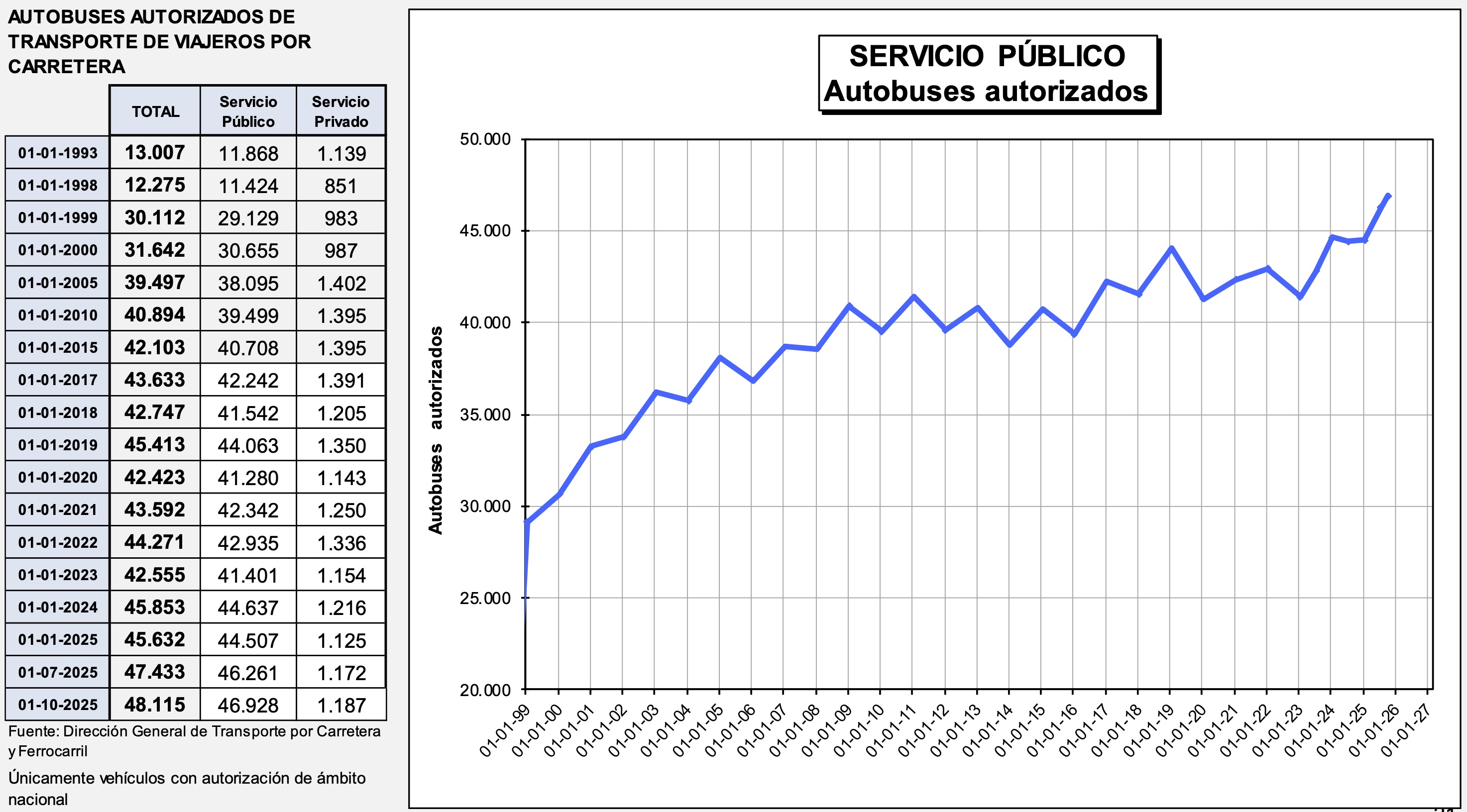 En cuanto a la oferta del transporte de viajeros en autocar, el número de autobuses de servicio público y ámbito de autorización nacional autorizados asciende, a 1 de octubre de 2025, a 46.928. Tres meses antes era de 46.261