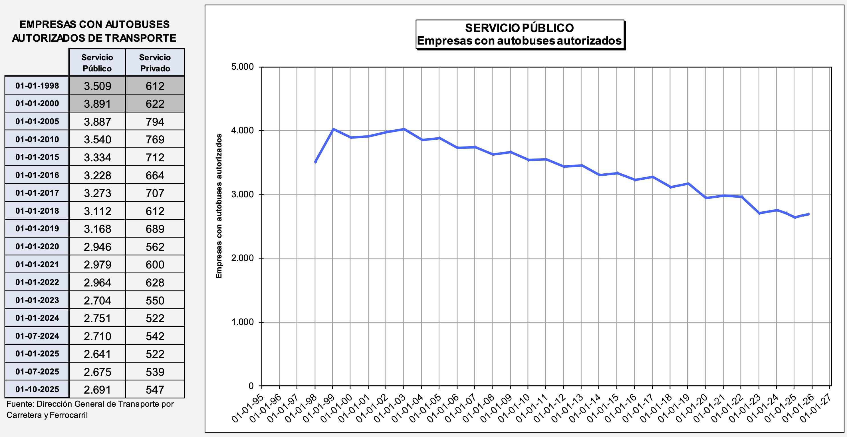 Por su parte, el número de empresas con autobuses autorizados de servicio público y ámbito de autorización nacional, a 1de octubre de 2025, es de 2.691, frente a los 2.675 del pasado mes de julio.
