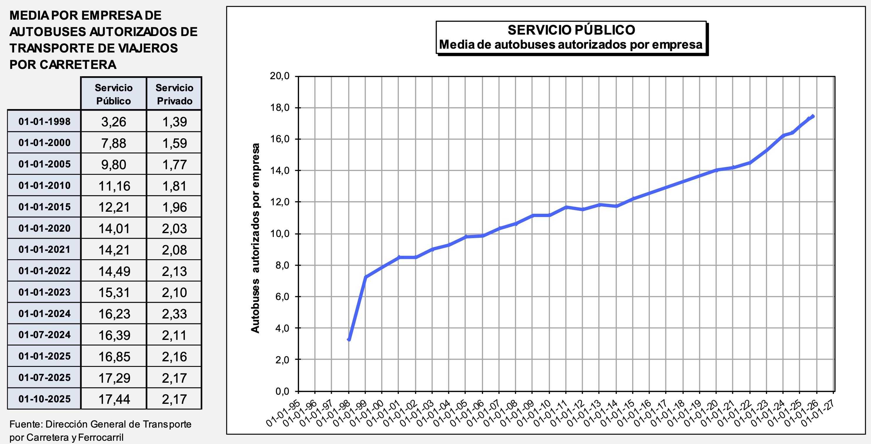 A su vez, la media del número de autobuses autorizados de servicio público por empresa es de 17,44 a 1 de octubre de 2025 frente a la media de 17,29 que se alcanzó el 1 de julio de este año.