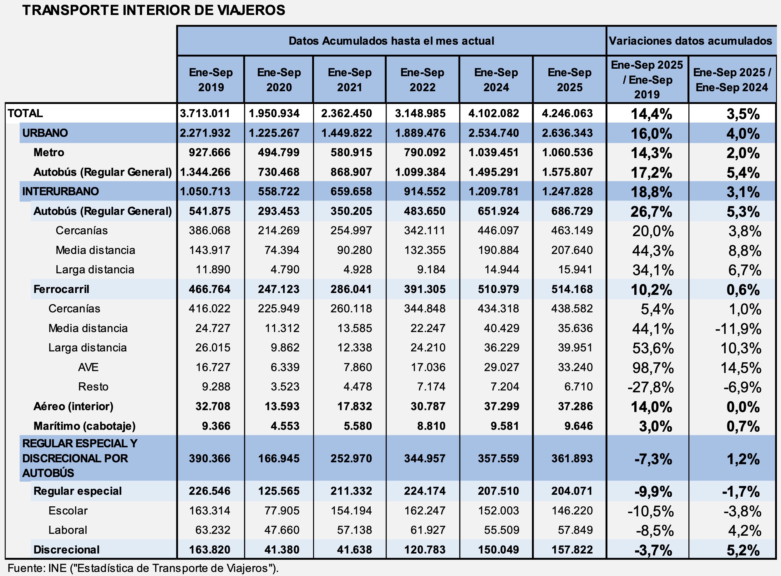 Por otro lado, según los datos publicado por el INE, de enero a septiembre de 2025 la demanda de viajeros del autobús superó los 4.244 millones, frente a los 4.100 millones de 2024 y los 3.711 de 2019.