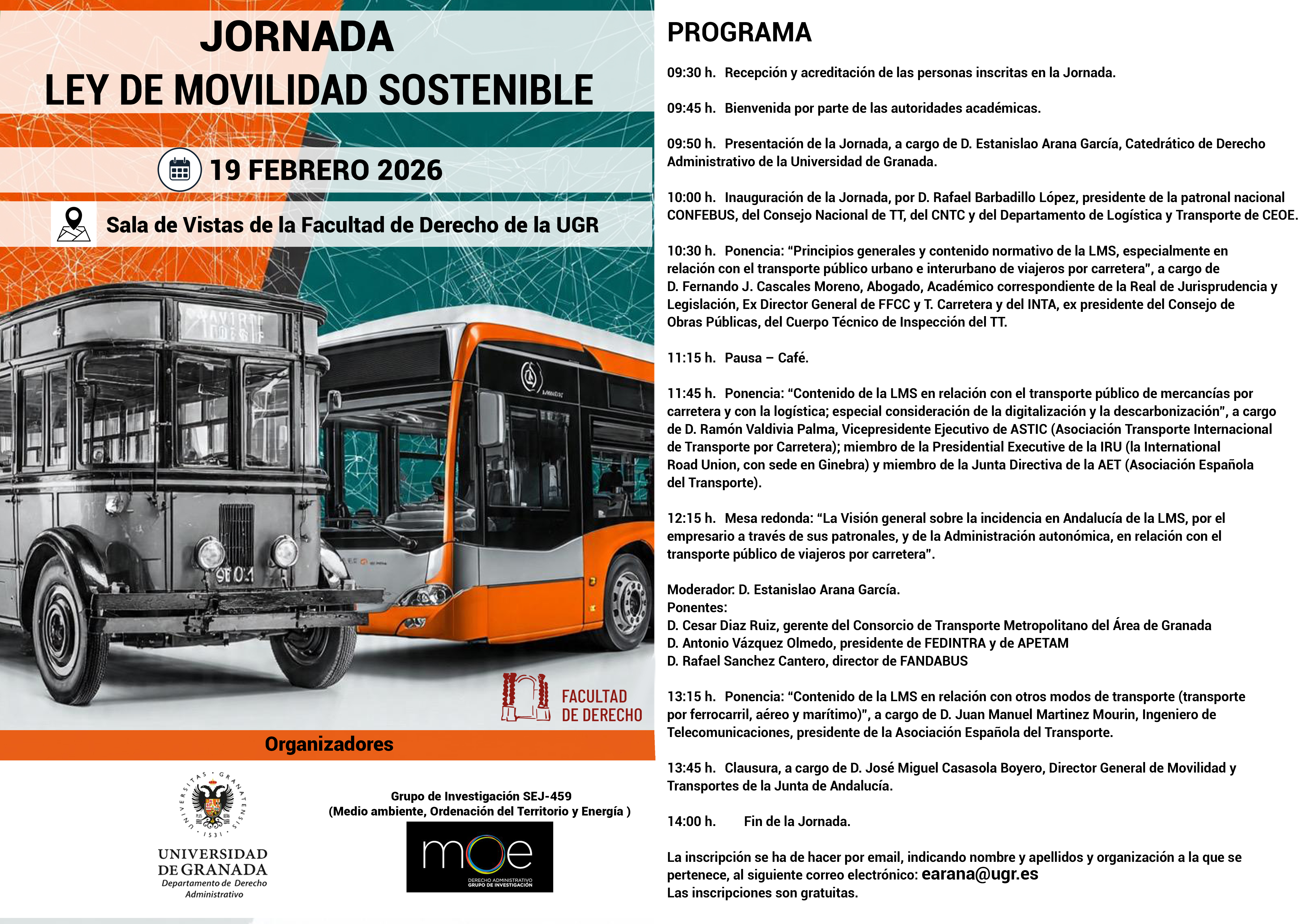 El próximo 19 de febrero, la Universidad de Granada acogerá una jornada técnica sobre la Ley de Movilidad Sostenible (LMS). Un encuentro de alto nivel académico y profesional en el que se analizará en profundidad su contenido y alcance, con especial atención a relevancia estratégica en el transporte público por carretera.
