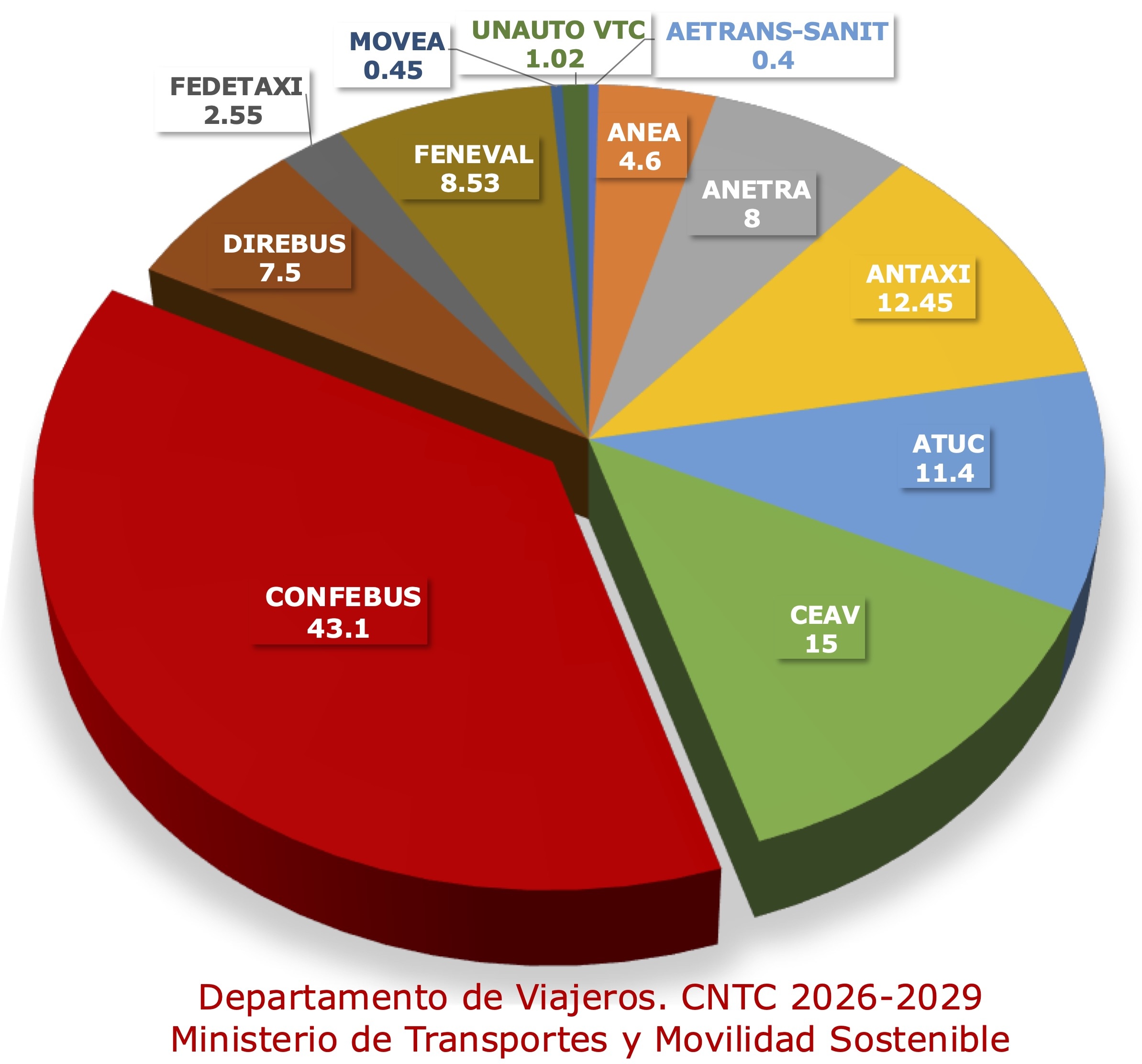 En concreto, la Confederación cuenta con 43,1 votos de un total de 115, con lo que triplica a la segunda organización con mayor peso en el Pleno de Viajeros. Además, CONFEBUS cuenta con la totalidad de los votos en la sección de Estación de Autobuses, con la mayoría de los votos en la sección de Transporte Público Interurbano de Viajeros en Autobús (69%) y con un 24% de los votos en la sección de Transporte Público Urbano.